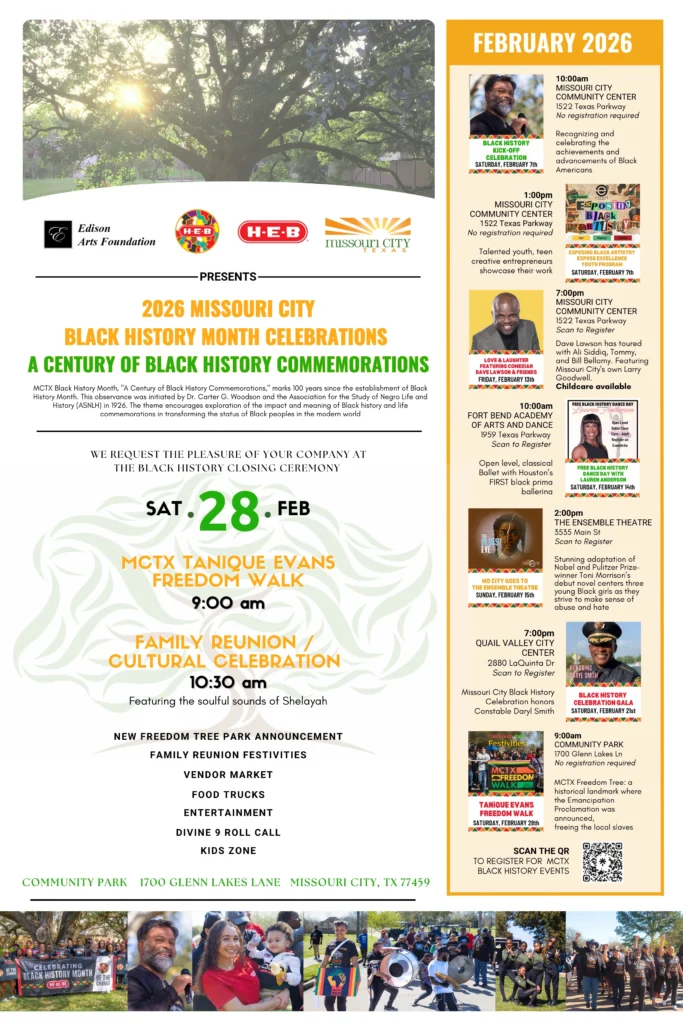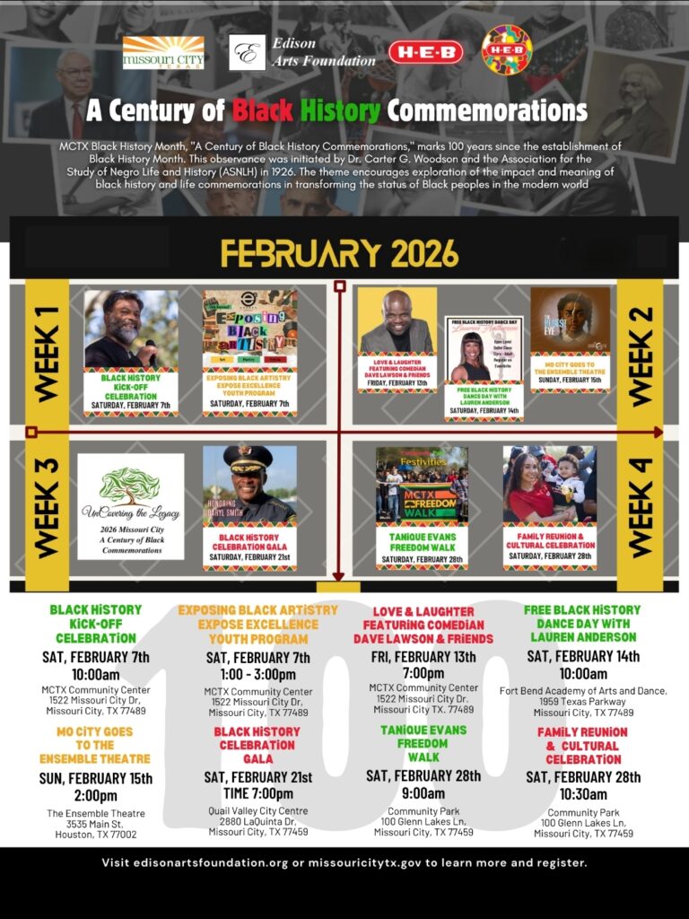 The Edison Arts Foundation is excited to once again partner with the City of Missouri City to celebrate the 2026 Missouri City Black History Month Celebration. Founded in 2015 alongside the late Councilman Don Smith; the Annual Missouri City Black History Month-long Celebration recognizes and celebrates the achievements and advancements of Black Americans and their central role in U.S. History.
